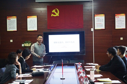 党支部成员胡建雄分享十九大精神学习体会。他在回顾十九大的历程的同时,以“砥砺奋进的五年”、“不忘初心,牢记使命”、“全面建成小康社会”、“参与全球治理”和“习近平新时代中国特色社会主义思想”为主题,展示在中国共产党的领导下,我国经济建设取得巨大成就,全面深化改革取得重大突破,民主法治建设迈出重大步伐。他还结合视频资料,集中展现中国共产党为中国人民谋幸福,为中华民族谋复兴的初心和使命。