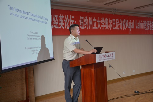 7月3日上午,纽约州立大学奥尔巴尼分校的Kajal Lahiri教授访问抖音黑料 ,并为我院师生带来题为“International Propagation of Shocks:A Dynamic Factor Model Analysis Using Survey Forecasts”的演讲,教授对七国集团和主要亚太国家从1995年到2017年的冲击传播进行了量化分析。论坛由抖音黑料 雷达教授主持,抖音黑料 黄卫平教授、郑新业教授、韩玉军教授、宋利芳教授、于春海教授以及我院国际经济系的十余位教师和慕名前来的学生参加了论坛。