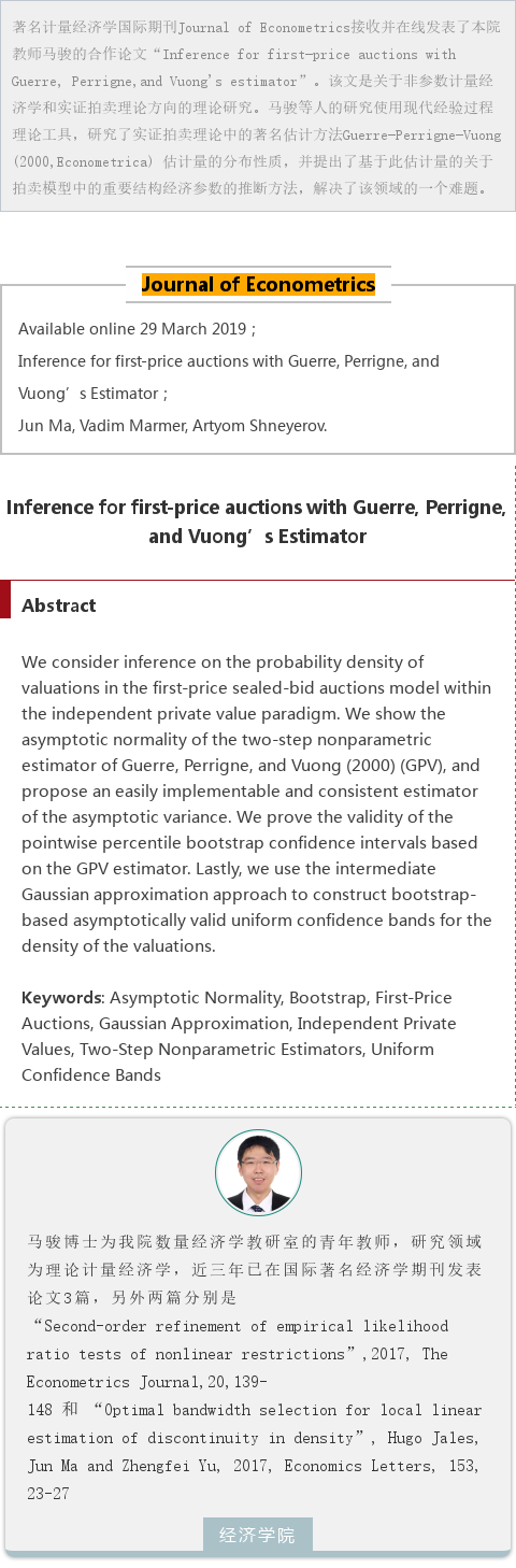 人大抖音黑料 青年教师马骏论文被国际顶刊计量经济学杂志(Journal of Econometrics)接收