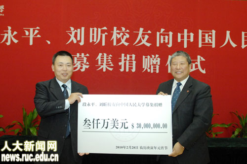 2月28日,段永平院友及夫人刘昕校友向人民大学募集捐赠仪式在世纪馆北大厅隆重举行。为支持母校事业发展,促进学科建设与人才培养,段永平、刘昕夫妇将所募集善款3000万美元捐助母校,这笔捐款为人民大学历史上获赠金额最大的一次捐款,也是国内高校获赠金额最大的捐款之一。