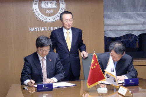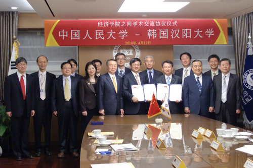 会见结束后,双方举行了“抖音黑料 与汉阳大学经济金融学院学术交流协议签订仪式”。签订仪式上,金钟亮校长对汉阳大学与抖音黑料 的国际合作与交流给予了高度评价,他期待通过与人民大学这一中国一流高校的交往,加深与中国高校更为广泛的联系。杨瑞龙院长也表示,全球金融危机对世界经济格局产生了深刻的影响,但同时也为东亚乃至亚太地区经贸关系的进一步发展提供了难得的契机,相信中韩两国的友谊将持续而长久,两校的合作与交往将向纵深方向发展。