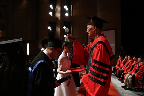 主持人邀请德高望重的卫兴华教授、吴易风教授、胡乃武教授为学生代表、北京市优秀毕业生荣誉称号获得者颁发学位证书,并为他们拨穗。