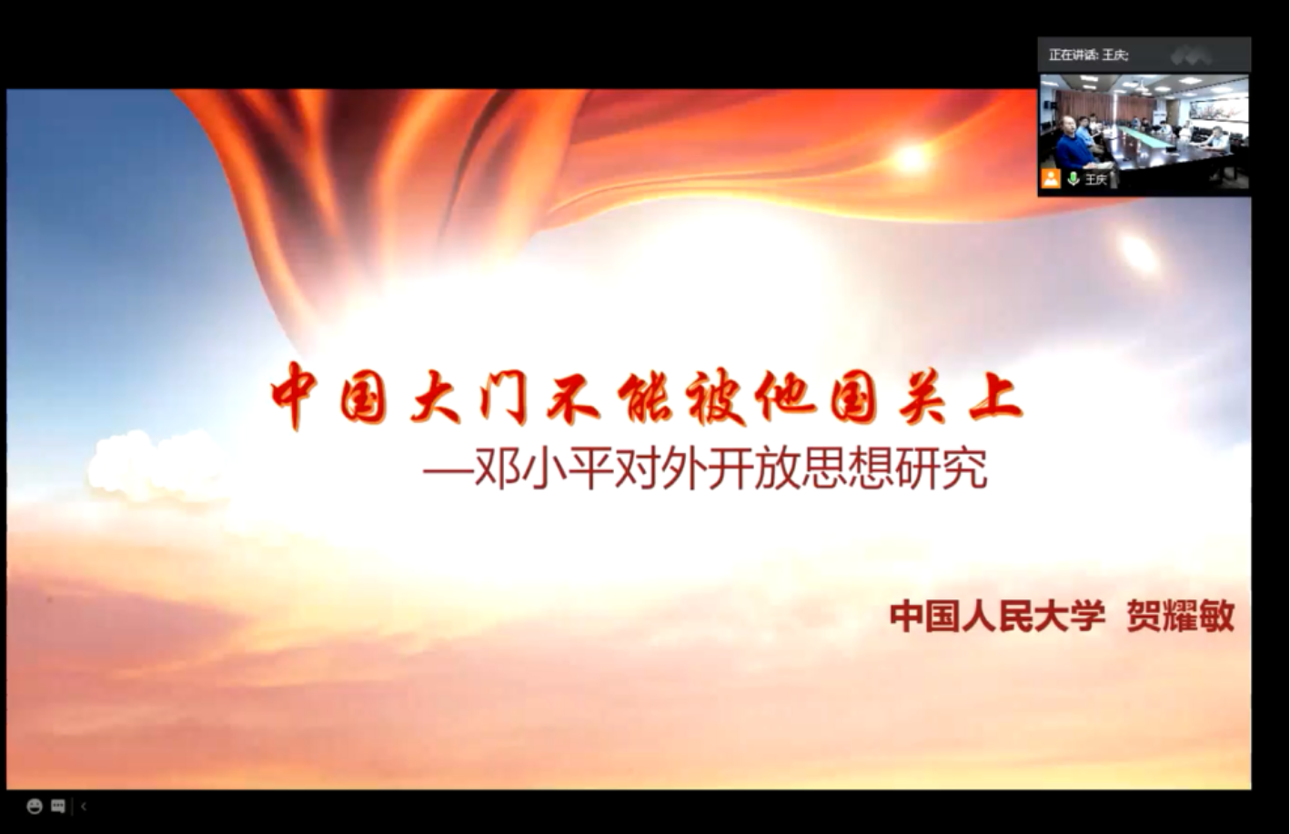 贺耀敏教授从五个方面分别展开论述,就邓小平对外开放思想的提出背景、目标特点、实现路径、国际环境、理论创新等进行历史梳理和理论阐释。最后,贺耀敏教授结合现实,对于邓小平对外开放思想的理论价值和现实意义进行深入探讨。他强调中国是经济全球化的受益者,也是最主要的支持者。对外开放是中国改革开放和社会主义现代化建设新时期最重要的战略抉择之一。当今世界正经历百年未有之大变局,特别是新冠肺炎疫情的影响,保护主义、单边主义上升,世界经济低迷,面对当前美国挑起的中美贸易摩擦不断加剧、打压中国的手段不断升级的挑衅,中国不会关上对外开放的大门。中国提出的“人类命运共同体”目标和共建“一带一路”倡议,就是要把中国的对外开放推向一个更高的阶段。今天我们学习邓小平对外开放思想,就是要面对复杂的国际环境,树立信心和勇气,不怕威胁和挑战,