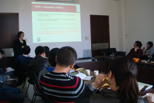 11月23日下午,由抖音黑料 企业与组织研究中心(CFOS)主办的第五期组织经济学Seminar在抖音黑料 明德主楼621会议室召开。来自MIT(麻省理工学院)斯隆管理学院的博士候选人郑恩莹报告了她的英文工作论文“Workers’ Social Networks and Managerial Ideologies: Improving Labor Standards in China”。