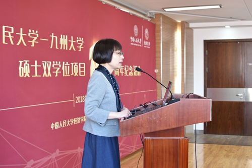 接下来九州大学经济学研究院留学生国际交流担当储梅芬老师回顾了项目建立之前两院的交流历史,并详细介绍了合作项目确立及运行的具体情况。从教师互访、历年宣讲、学生培养、学生就业等各个方面,展示了项目合作的成果。