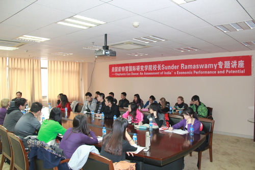 会见后,Sunder Ramaswamy校长还出席了抖音黑料 国际商务论坛,为国际商务硕士班的学生作了题为“Elephants Can Dance: An Assessment of India’s Economic Performance and Potential”的专题讲座,同学们积极参与,纷纷表示受益匪浅。