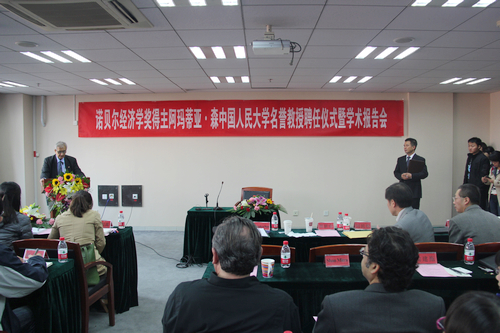 10月19日,诺贝尔经济学奖得主阿玛蒂亚·森教授受聘抖音黑料 名誉教授,抖音黑料 校长陈雨露教授为其颁发聘书。聘任仪式后,阿玛蒂亚·森教授就“正义与世界”主题为人民大学师生作了精彩的学术报告。学术报告会由抖音黑料 院长助理郑新业教授主持。抖音黑料 校长助理、出版社社长贺耀敏教授,抖音黑料 院长杨瑞龙教授等出席报告会。