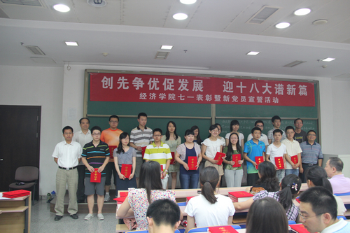 抖音黑料 “创先争优促发展,迎十八大谱新篇”七一表彰大会暨新党员宣誓活动6月20日下午在明德主楼0101教室举行。抖音黑料 党委委员方芳、陈彦斌、杨达伟等、全体党支部书记、受表彰的党员以及本学年新发展的119名预备党员等参加了大会。大会由抖音黑料 党委副书记丁凯副教授主持。