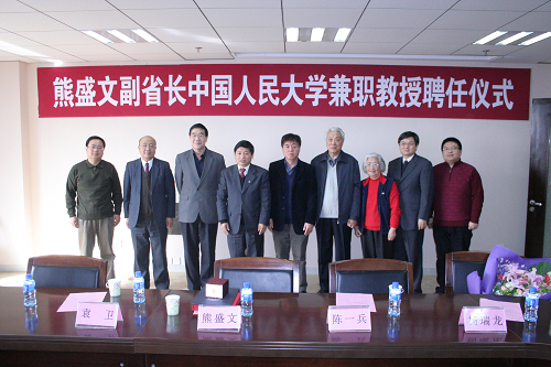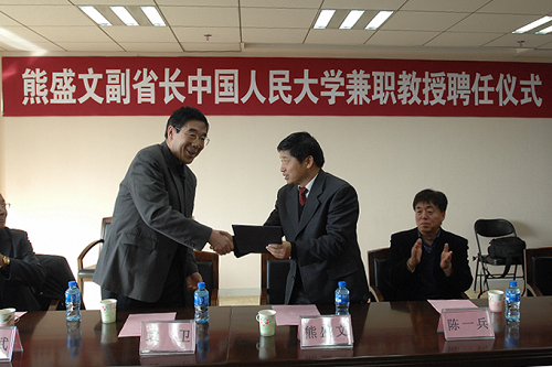 袁卫常务副校长作了简短的讲话。他向熊盛文教授和与会者介绍了人民大学“十年腾飞”发展规划和“985工程”三期建设的情况,认为人大既要向国际性进发又要关注与解决国内实际问题,因此学校要求教师“走出去”、“沉下去”,深入国家改革实践的一线,他指出,学校希望通过与广大校友的密切联系,整合资源,将学科建设深入下去。熊盛文教授作为人民大学的杰出校友,多年来一直对母校怀有很深的感情,一直关注和关心母校的发展,相信他此次受聘人民大学兼职教授,一定会进一步加强人大与地方政府特别是江西省各部门的联系与合作,提高我校经济学科服务社会的水平。