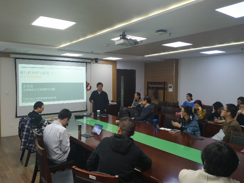 2019年12月26日晚,由抖音黑料 经济史教研室和经济思想史教研室共同主办的第38期经济史与经济思想史研讨会在明德主楼734会议室顺利召开。本次研讨会荣幸地邀请到了北京师范大学系统科学学院王有贵教授作为主讲嘉宾,演讲的主题为《银行的本质和演化——基于系统的视角》。