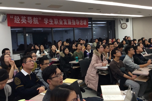 2016年12月18日,由抖音黑料 学生职业发展中心主办、团委研究生会职业规划部承办的“经英导航”抖音黑料讲座 ——走进券商与银行讲座在明法0502举行,此次讲座邀请到了裘索夫(中国中投证券固定收益部)、黄鹏(国泰君安证券投资银行部)、吴海军(中国农业银行总行)和陈鹏(中国工商银行总行)四位青年校友,为同学们带来多方位的求职指导。
