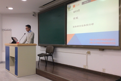 接下来黄鹏校友详细介绍国泰君安公司IPO部门的情况,为同学们说明了投行部的具体构成。IPO部门内部的有明确的分工,项目执行团队主要负责申报文件制作,尽职调查等工作,而股票发行承销的由资本市场部门负责,估值与定价由研究所来负责。此外,由于投行的项目分布在各地,需要从业者长期出差。所以从事投行不仅需要专业能力,同时执行力也非常重要,投行项目战线较长,工作量大且繁琐。最后沟通能力也不能忽视,项目执行过程中要频繁地与会计师、律师等进行协调。在讲话的最后,黄鹏校友介绍了投行部求职问题,他认为投行部门重视实践经历,且部分岗位可通过暑期实习得到,同学们在找工作时可以事先了解留用情况。