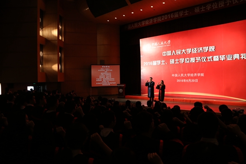 主持人邀请吴付来副书记、丁向群女士、张宇院长、杨瑞龙教授、方福前教授、孙久文教授、刘瑞教授、赵国庆教授、刘凤良教授、郑超愚教授、王晋斌教授和陈彦斌教授等一起为毕业生颁发学位证书,758名学士和硕士学位获得者分批走上讲台,接受师长们授予学位证书和拨穗正冠。