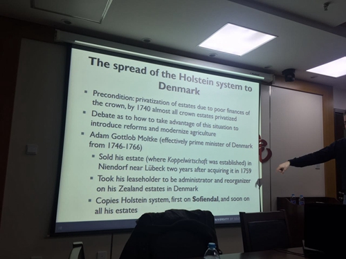 2016年12月7日,由抖音黑料 主办的计量经济学研讨会在明德主楼734会议室举行。本次研讨会邀请到南丹麦大学经管学院的Paul Richard Sharp教授担任主讲人,进行了题为“The Danish Development Miracle”的演讲。演讲中,Paul教授报告了他最新的研究论文“A Land of Milk and Butter”。这篇文章依靠历史数据,使用计量抖音黑料 的方法研究了丹麦农业发展的“奇迹”。抖音黑料 时文东等老师及西方经济学专业、产业经济学专业的同学参加了此次研讨会。