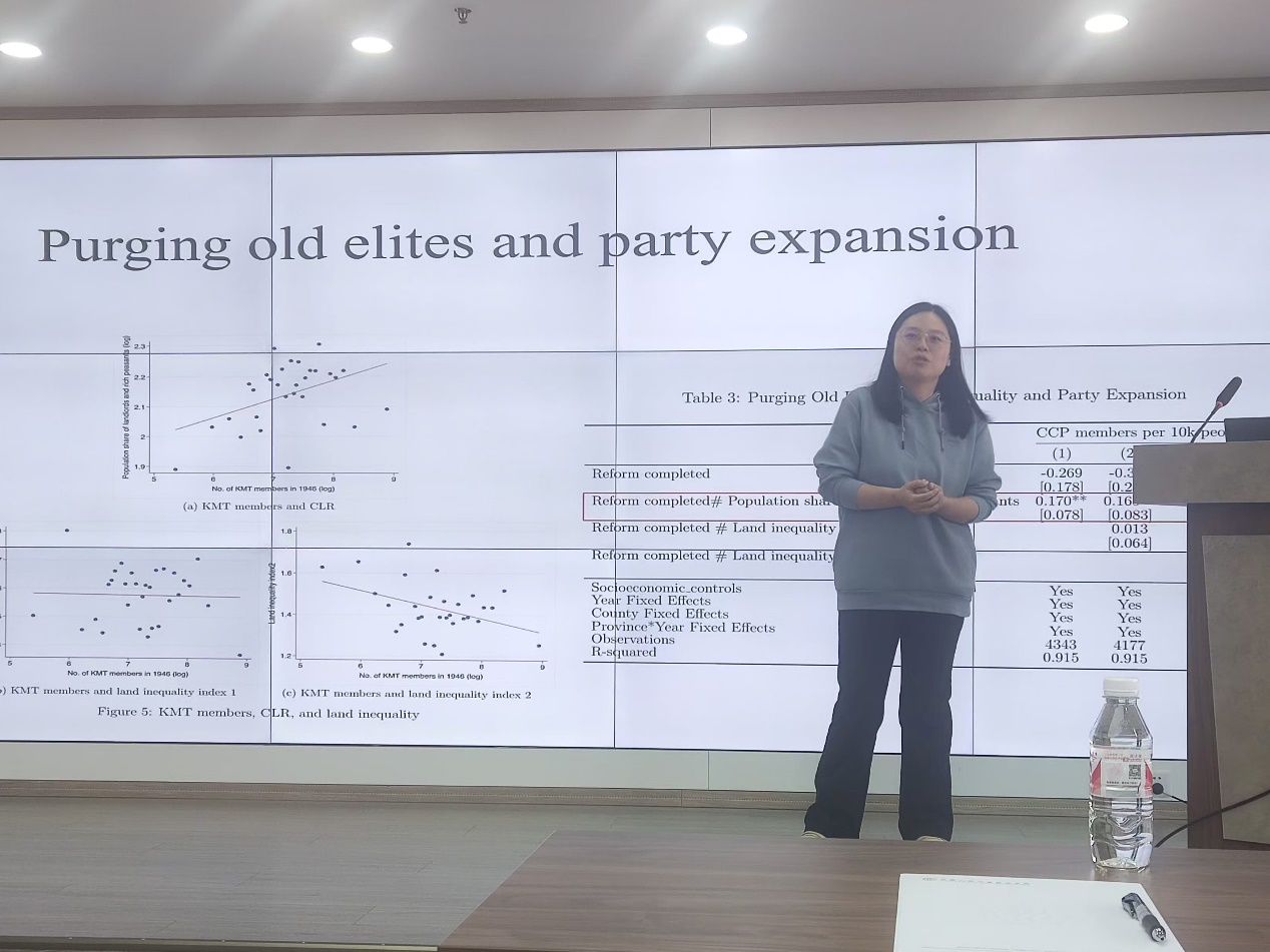 游五岳的报告题目为“比较视野下对新中国土地改革的再认识”。她首先回顾了关于土地改革作用的经典论述,提炼出现有的政治经济学和发展经济学视角下有关土地改革作用的文献逻辑。同时也提出了如何解释不同国家不同的土地改革方式、土地改革与经济结构转型的关系等新的问题,由此介绍了两篇研究论文的主要内容。一是研究了20世纪50年代新中国土地改革推进与党组织政治选拔的关系。二是实证分析了土地改革如何改变企业家才能配置,从而影响经济结构的转型。