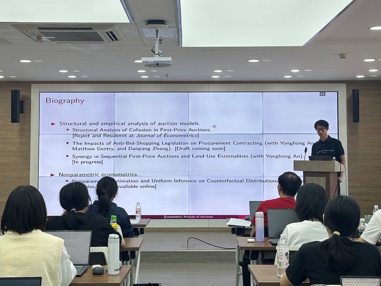 郭镠溢介绍了他开展的“微观计量经济学中的实证拍卖研究”。他首先介绍了拍卖市场的广泛性和重要性,包括艺术品、政府竞标、债券发售和土地出售等领域,之后详细阐述了拍卖理论的核心,即不同拍卖形式下的均衡出价策略,并分享了他在低价格拍卖中识别共谋行为和推断竞标者信息的研究成果。研究构建了一个静态模型,用于在未知共谋机制下识别共谋者,并推断竞标者的价值分布。此外,研究还讨论了拍卖环境的复杂性,包括竞标者的抑制性、不可观测因素和风险偏好等。该研究为设计最优拍卖机制提供了理论基础和实证分析方法。