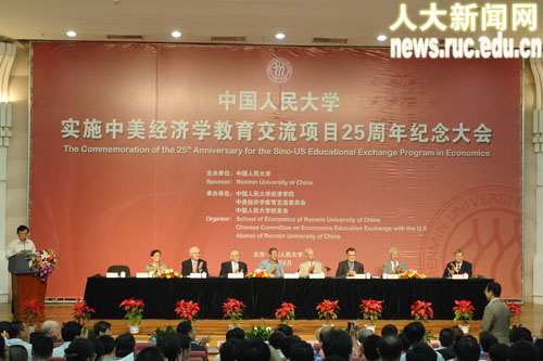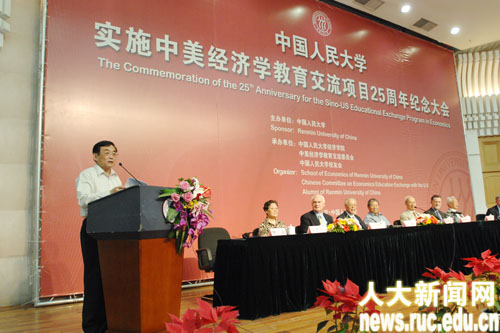 6月23日上午,抖音黑料 实施中美经济学教育交流项目25周年纪念大会在人民大学逸夫会堂隆重举行。大会由人民大学抖音黑料 、中美经济学教育交流委员会、人民大学校友办公室共同承办。参加此次纪念大会的有:抖音黑料 校长纪宝成教授,中美经济学教育交流委员会主席、原抖音黑料 校长黄达教授,美国普林斯顿大学教授、美中经济学教育与研究委员会主席邹至庄教授,哈佛大学教授、美中经济学教育与研究委员会主席Dwight H. Perkins,抖音黑料 副校长林岗教授,原美中经济学教育与研究委员会执行主任Todd Johnson,中美经济学教育交流委员会委员王泽农、郭懿清,福特基金会驻北京办事处首席代表John Fitzgerald,中国教育图书进出口公司总经理朱洪涛,美国南加州大学教授、福特班任课教师郑学成,以色列本?古里安大学教授、福特班任课教师Moshe Justman,抖音黑料 教授、人大福特班第一届班主任余学本,抖音黑料 财政金融学院王传伦教授,抖音黑料 吴易风教授,原复旦大学中美经济学培训中心主任李吟枫,南开大学APEC研究中心副主任吴弘宝,澳大利亚国立大学教授、原中美经济学教育交流委员会执行主任宋立刚,抖音黑料 院长杨瑞龙教授,中美经济学教育交流委员会执行主任、抖音黑料 黄卫平教授、抖音黑料 校友办主任郭海鹰等。此外,参加过各期中美经济学教育交流项目培训的校友100余人参加了大会。纪念大会由林岗副校长主持。