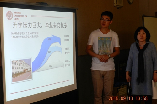 日方同学就海士町产业振兴政策、隐歧岛高龄人士医疗保障、岛上教育事业发展和地域交通条件优化等主题分别展示了各自的调研成果和展望,日方同学调查准备充分、问题针对性强,资料展示详实,给在场师生留下深刻印象。中方学生杨志鹏和吴亚楼以“中国农村教育的地区差异比较”为主题,分别以辽宁省北镇市、江苏省泰兴市为例阐述了由于经济条件、文化观念等因素造成的中国农村教育的地区差异,并对农村教育发展方向进行了展望。在互动环节中,回答了日本同学关于促进中国农村教育发展政策的疑问。
