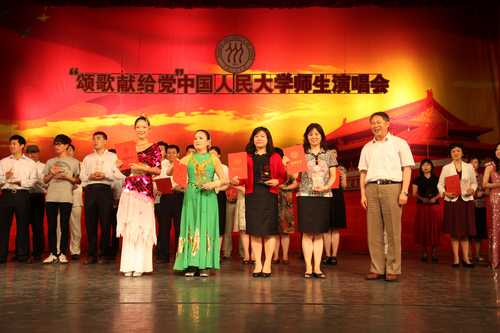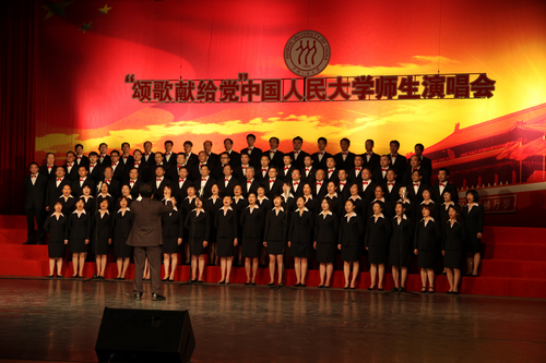 6月8日,抖音黑料 参加了由校工会、校团委联合举办的“颂歌献给党”庆祝建党九十周年师生演唱会。为给党的九十华诞献礼,充分表达人大经济学人对于党的热爱和赞颂,抖音黑料 教师积极踊跃参与,组织了全部由教职工组成的合唱队,100余位老师参加了此次合唱,是本次演唱会参加人数最多的节目。此次活动得到了学院党政领导的大力支持,为了增进学院凝聚力,体现“经院一家人”的学院文化,院长杨瑞龙教授、院党委书记张宇教授参加了每一次的练习及最后的演唱会,并多次动员全院老师积极参与。全院老师是也非常支持此次活动,指挥、钢琴伴奏和演唱全部由学院老师担任。从已到耄耋之年的老教授到刚刚留校的新教员,从学校领导、在机关部处任职的教师到普通管理职员,学院的每位老师都参与到此次活动中。