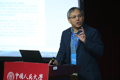 Amitrajeet A.Batabyal教授的报告题目是“熊彼特创意阶层竞争、创新政策和地区解决发展”。他从手机市场的竞争来切入区域创新话题,并就是否存在均衡的增长道路来谈了自己的观点。他通过模型来证明了,保护企业家专利有助于推动区域的创新,所以应该在财政政策上减少税收,促进创新。
