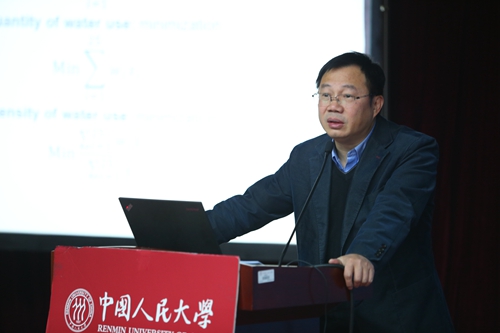 石敏俊教授的报告题目是“基于北京市水资源约束的诱导适应性制度变迁”。他通过对比北京市20年来的人口、GDP和水使用量,提出了弱可持续性和强可持续性的概念。接着,他以投入产出为分析框架,分别做了三次最优化分析,得出的结论是产业结构的演进和城市转型的背后反映出城市战略上的变化。