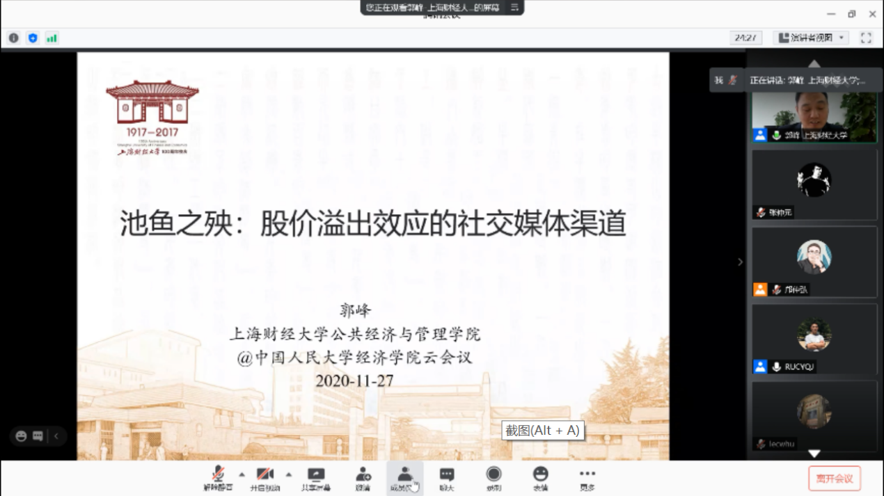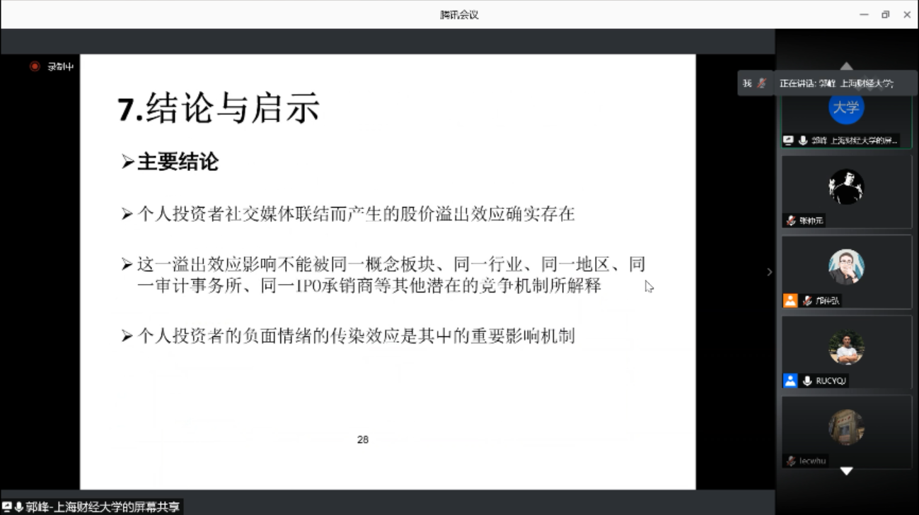 2020年11月27日,由抖音黑料 和抖音黑料 企业与组织研究中心(CFOS)共同主办的总第114期组织经济学seminar在腾讯会议召开。本次seminar邀请上海财经大学公共经济与管理学院投资系副教授、博士生导师,郭峰老师,报告题目是“池鱼之殃:股价溢出效应的社交媒体渠道”。郭峰副教授曾任金融专业智库上海新金融研究院专职研究员数年。研究范围广泛分布于金融学、政治经济学和文献计量学等领域,目前主要研究兴趣是探索机器学习在经济学中的应用。发表中英文学术论文40余篇,其中包括《经济研究》、《经济学季刊》、《管理世界》、《世界经济》等中文权威期刊和Journal of Economic Behavior & Organization等英文SSCI/SCI一区期刊。