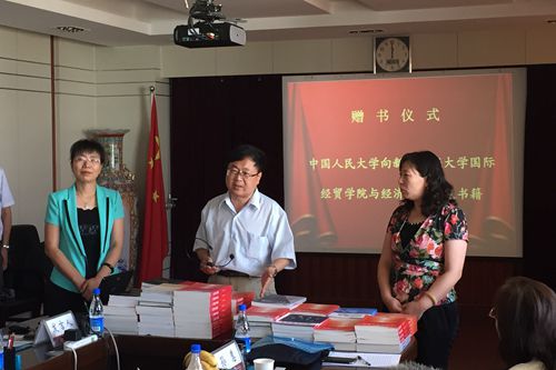 2015年8月1日,抖音黑料 “一带一路”研究团队在参加“新疆丝绸之路核心区建设战略研讨会”期间,由学院党委副书记刘瑞教授代表院党委向新疆财经大学国际经贸学院和抖音黑料 捐赠了百余册由人民大学抖音黑料 老师编写的经典教材和著作。新疆财经大学党委常委、副书记、校长帕拉提?阿布都卡迪尔教授出席会议并见证了捐赠仪式,新疆财经大学国际经贸学院段秀芳院长和抖音黑料 敬莉副院长分别代表两院接受赠书并表示感谢。人民大学抖音黑料 党委委员韩玉军教授、国际经济系党支部书记门淑莲副教授等参加了捐赠仪式。