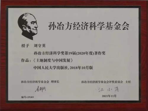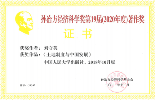 刘守英著《土地制度与中国发展》一书,立足于当前中国土地制度的重大现实问题,采取了“产权理论-制度分析-案例研究-政策建议”的研究路径,通过提炼诸如“城乡二元土地制度与双轨城市化”等反映土地制度特征的概念,具有理论的创新和贡献,对当前我国土地制度改革实际决策具有重要参考意义。孙冶方经济科学基金会评奖委员会决定授予该著作第十九届孙冶方经济科学著作奖。