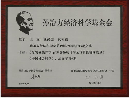 王直、魏尚进、祝坤福著《总贸易核算法:官方贸易统计与全球价值链的度量》一文,针对全球价值链革命使得传统贸易总量统计难以反映世界贸易格局的真实价值分布这一难题,突破了应用里昂惕夫经典方法的局限,提出贸易总核算法,由此揭示了隐藏在官方贸易统计数据背后的跨国生产分工信息,并建立起一个大时间序列面板数据集,为深入研究各种与跨国生产分工和全球价值链相关问题,提供了一个有用的工具和新的数据源。孙冶方经济科学基金会评奖委员会决定授予该论文第十九届孙冶方经济科学论文奖。
