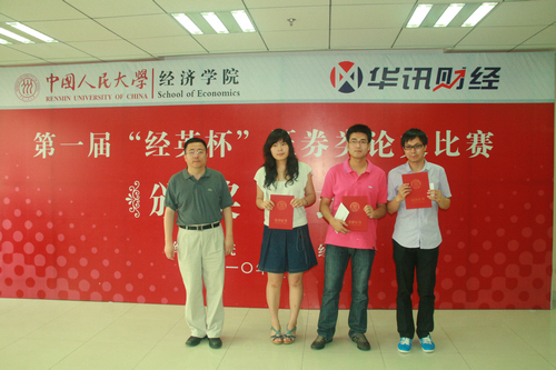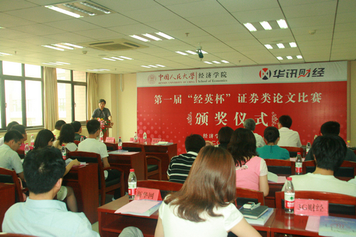 6月9日下午,由抖音黑料 与华讯财经联合举办的第一届“经英杯”证券类论文比赛颁奖仪式在抖音黑料 728会议室举行。抖音黑料 院长杨瑞龙教授、华讯财经副总裁余和平先生出席颁奖仪式并致辞。抖音黑料 党委书记张宇教授、抖音黑料 经济系副主任周业安教授、华讯财经副总裁倪鸣先生也出席了颁奖仪式。颁奖仪式由抖音黑料 党委副书记丁凯博士主持。