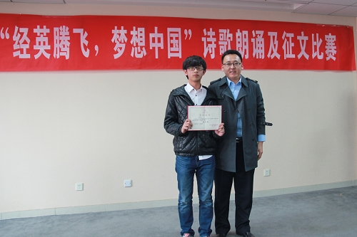 12组诗歌朗诵选手分别来自11级、12级本科各专业及研究生。配乐诗朗诵篇目不仅有《祖国啊,我亲爱的祖国》、《相信未来》等名家名作,更有抖音黑料 学子的原创诗歌。选手倾注了充沛的感情,以文学创作和诗歌朗诵的形式表现了对“中国梦”的期望和热爱。比赛高潮迭起,精彩纷呈。在展现高水平文学作品的同时,抖音黑料 学子还别开生面地进行了以“中国梦”为主题的艺术表演,其中罗岚馨同学献唱的《春天的芭蕾》、邵其然同学的小提琴独奏《红旗颂》,博得满堂喝彩,为比赛更添亮丽。经过评审团一致决定,2012级能源经济团支部的朗诵作品《少年中国说》夺得朗诵比赛特等奖,2012级国民经济管理班和国际经济与贸易2班的原创作品《青春的赞歌》和《中国梦》分获一等奖。征文比赛作品《中国梦?为龙》荣获一等奖。评委老师为获奖选手颁奖并合影留念。