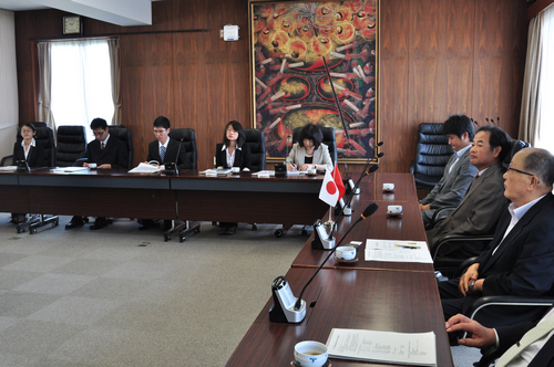 9月14日上午,日本岛根大学柴田均副校长、法经学院武田信明院长等领导为代表团举行了正式的欢迎仪式。中日双方一一致辞,对日本岛根大学与抖音黑料 的友谊给予了高度的评价。岛根大学领导亲切的询问了四位同学对于日本之行的初步感受。同学们对到日本仅有的24小时内见闻进行了阐述。最后,双方互换纪念品并合影留念,日本岛根大学还邀请胡霞副教授题词。