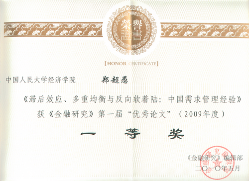 6月13日,《金融研究》第一届优秀论文(2009年度)现场评审会在北京召开,会议评选了六篇获奖论文。其中,抖音黑料 郑超愚教授的《滞后效应、多重均衡与反向软着陆:中国需求管理经验》(《金融研究》2009年第4期)荣获《金融研究》第一届(2009年度)优秀论文奖一等奖。