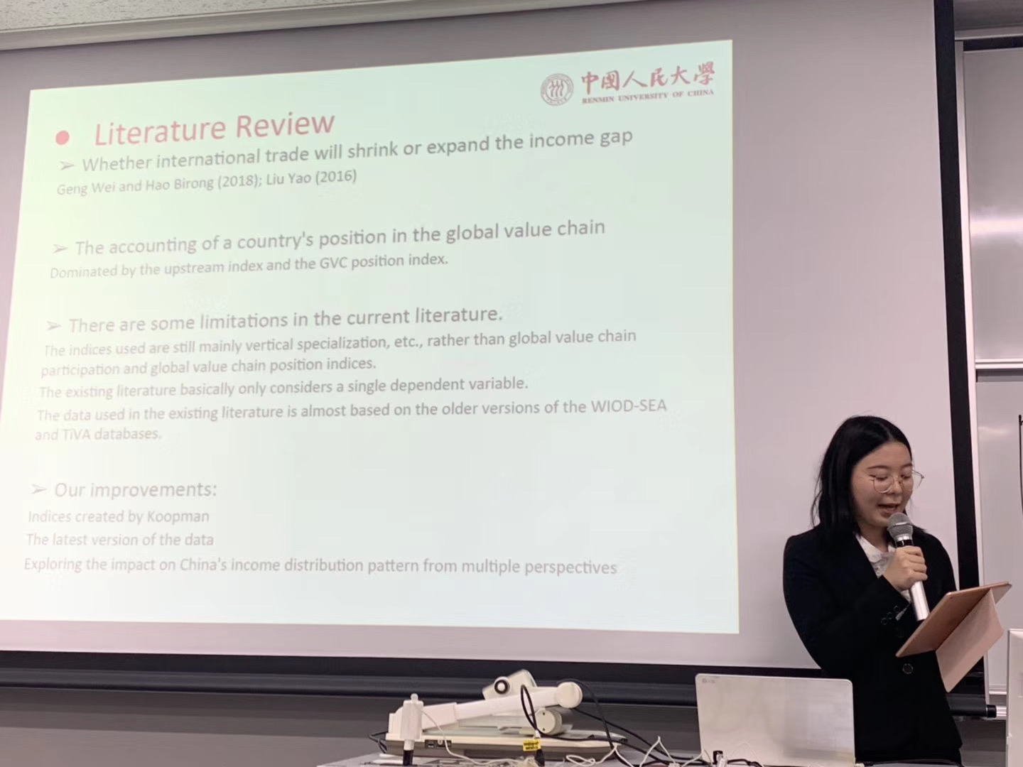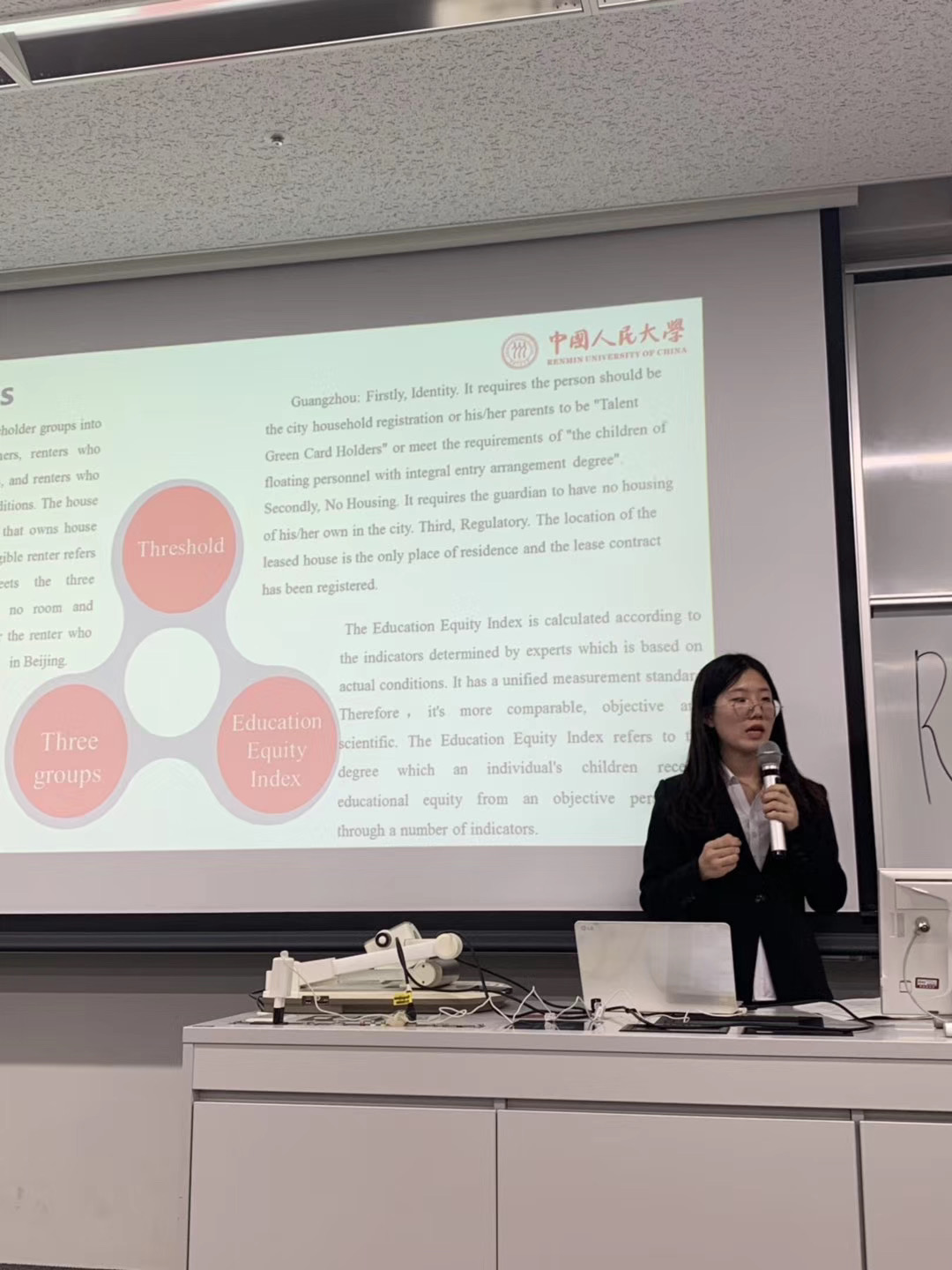 本次研讨会有两篇来自人民大学的论文发布。马科伟和张奕纯同学的论文题目是“EducationEqualityStudy: Survey-BasedEffectResearchof ‘EqualRightsforHomeTenantsandOwners’ onGroups”,主要运用方差分析与R型因子分析法探究了租售同权政策对流动人口子女实现教育公平的改善程度及其主要影响因素。蹇沛利和吴爱旌同学的论文题目是“The Impact of Global Value Chain Participation on Income Inequality: an Empirical Study Based on China”,应用随机效应模型,研究全球价值链参与程度与位置对中国各行业收入差距的影响。