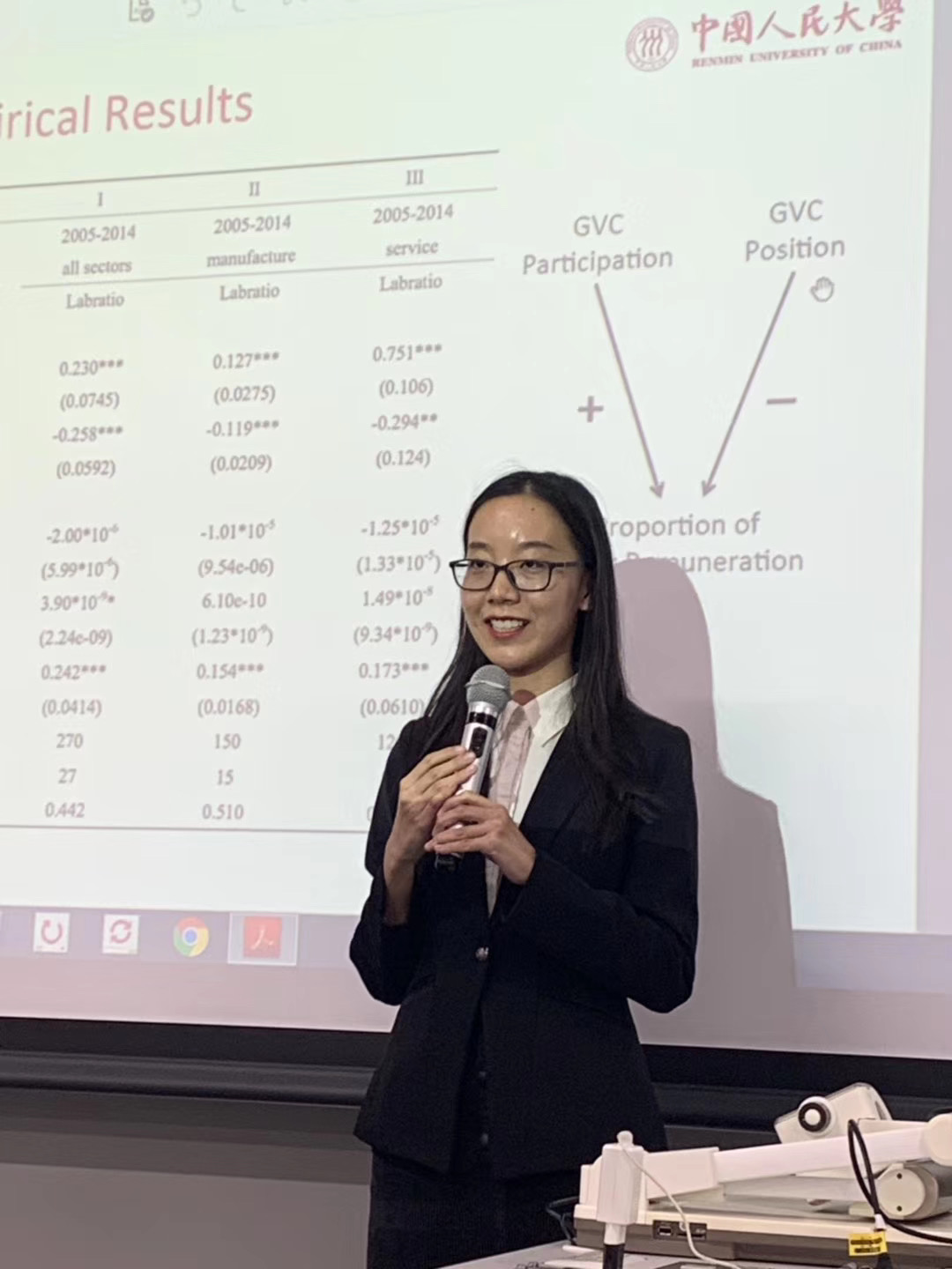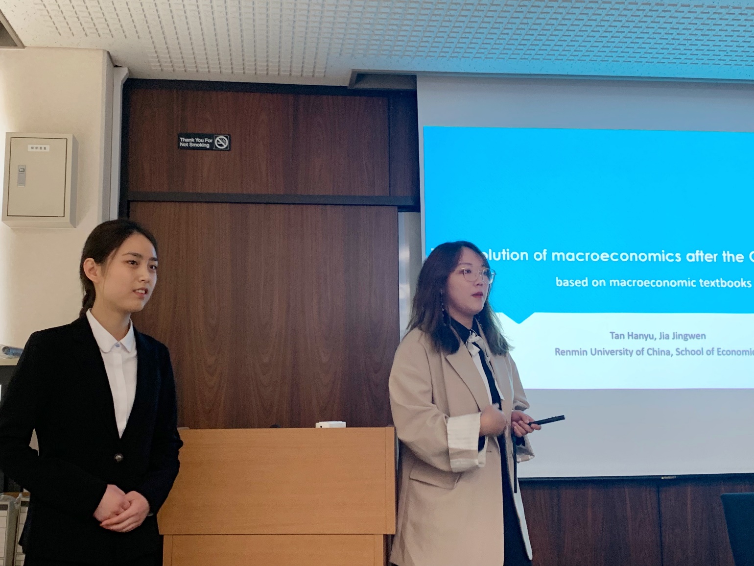 本次研讨会共有两篇论文来自人民大学。谭涵予和贾静雯同学的论文题目是“The Evolution of Macroeconomics after the Great Recession: based on Macroeconomic Textbooks”,主要以宏观经济学教材的内容为研究对象,讨论了大萧条后宏观经济学研究领域是否发生了革命。王前超和罗妤同学的论文题目是“Environmental Regulation, Export Trade and Pollution Emissions: Evidence from 30 Provinces in Mainland China”, 利用空间计量经济学的方法,研究了中国大陆30个省份(不包括西藏)的污染溢出效应,并分析货物出口贸易在其中发挥的作用。