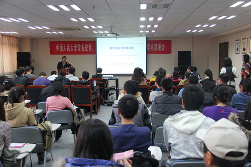 朱科敏教授发表了题为《股市是经济的推动器》的学术演讲。他通过对当前的中国经济、从战略和国家两个层面如何看待股市功能、从战术层面上如何振兴股市以及对近期中国证券市场的预测及股票投资的标准这四个方面进行讲解,认为良好发展的股市可以稳定大家的财富预期,使居民可以放心胆大地消费,企业可以稳健地扩大投资。股市不仅是融资者和投资者的桥梁和纽带,股市更是经济的推动器。股市的良好发展,可以促进消费,增强投资信心,推动经济的缓慢复苏,为结构转型赢得时间。股市对于形成社会中产阶层,形成稳定的社会财富结构有着重要的意义。朱科敏教授以其多年证券从业经验,为学院师生上了生动的一课。