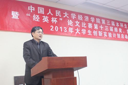 11月20日下午,抖音黑料 第三届本科生学术论坛暨第十三届“经英杯”论文比赛颁奖、第十四届“经英杯”论文比赛启动、2013年大学生创新实验计划启动仪式在明德主楼728会议室举行。本届论坛旨在增加本科生的知识积累,提高学术研究能力,促进本科生学术水平和抖音黑料 能力的提高。学校教务处处长洪大用教授,抖音黑料 院长杨瑞龙教授,副院长王晋斌教授,院长助理于春海副教授,以及赵峰副教授,宋枫副教授,李三希博士等出席了本次论坛。论坛开幕式由抖音黑料 党委副书记丁凯副教授主持。