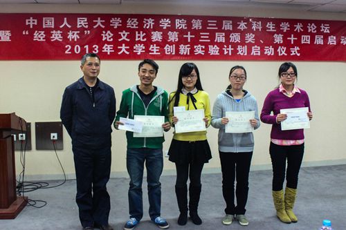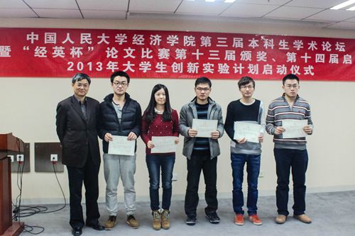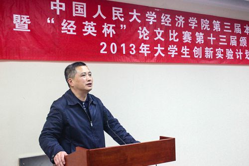 在颁奖环节,洪大用处长、杨瑞龙院长、王晋斌副院长、于春海副教授分别为获奖者颁发证书及启动资金,获奖学生代表章逸然、周泽宇上台发表获奖感言,指导教师代表、2013年国家级“大创”指导老师宋枫副教授作为教师代表发言。