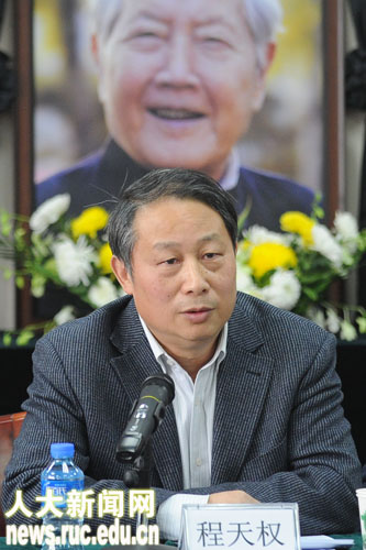 程天权书记在讲话中指出,宋涛教授是中国经济学界的泰斗,正是因为宋老和他那一辈的老同志共同的努力,才有了中国经济学现在的成就。宋涛教授他用自己97年的人生历史,书写了一个人民教师、一个共产党人、一个中国人的辉煌篇章,为社会、为后人做出了巨大贡献。他指出,在宋老去世的几天里,胡锦涛总书记、温家宝总理等党和国家领导人,以及来自社会各界和宋涛教授生前的朋友和学生,都以各种方式对他致以慰问和悼念,这都充分体现了宋涛教授崇高的学术地位和高尚师德品格。