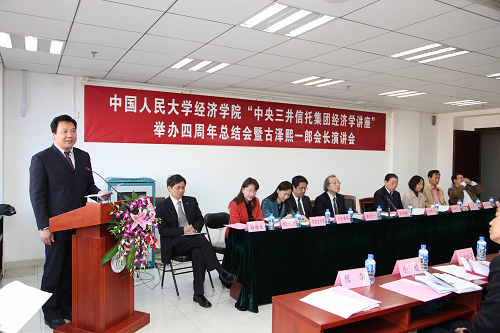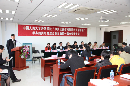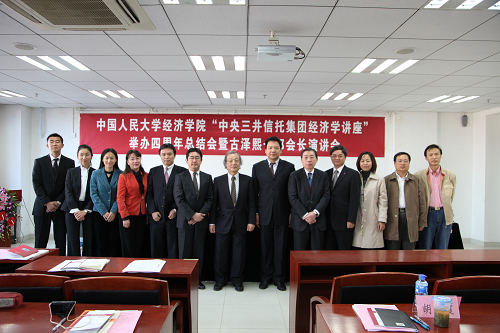1019日 上午,抖音黑料 “中央三井信托集团经济学讲座”举办四周年总结会暨古泽熙一郎会长演讲会在明德主楼0728抖音黑料 大讲堂举行。抖音黑料 副校长陈雨露教授,抖音黑料 “中央三井信托集团经济学讲座”主讲教授、同志社大学经济学部原总一教授,中央三井信托控股株式会社董事长古泽熙一郎先生,中央三井信托银行国际部部长今井康隆,抖音黑料 院长杨瑞龙教授,副院长刘瑞教授,人民大学招生就业处周蓉副处长,学生处张玲玲副处长,校报总编蒙彬,国际交流处王路芳,中央三井信托银行北京驻在员事务所所长田村宏生,中央三井信托银行国际部调查役小川桂,中央三井信托银行国际部有浦幸子等出席。抖音黑料 赵国庆教授、胡霞副教授、门淑莲副教授、陈彦斌副教授等也参加了会议。会议由抖音黑料 “中央三井信托集团经济学讲座”项目执行主任程华副教授主持。