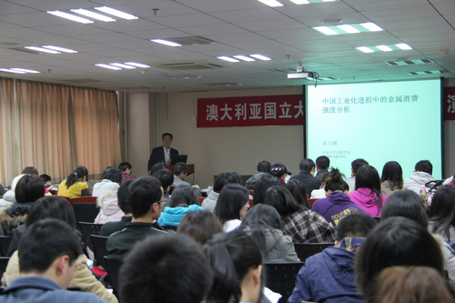 宋立刚教授具体地分析了中国工业化进程中金属消费的强度,并在理论上得出未来中国金属需求的强度和变化路径。他指出结构问题是目前中国经济发展所面临的最大问题,并就低碳经济、中国的城市化进程以及人均国民生产总值等相关问题和现场同学进行互动问答。宋立刚教授利用图表与数据详细地阐述了美国、日本、韩国等国家在其工业化进程中对金属消费的变化。针对城市化进程这个问题,他结合史实向同学们做出了详细的说明并根据其他国家金属需求的变化路径做出了自己的猜想。最后,宋立刚教授指出,我们应该辩证地看待低碳经济所带来的节能减排的要求。他认为,一方面低碳经济给工业化的发展提供了新的困难与要求,但另一方面也提供了一个经济发展、技术跳跃的机遇与挑战。