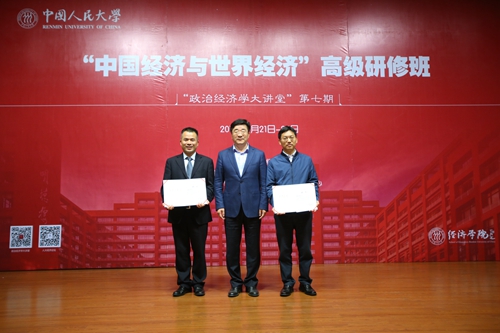 为了将理论界学习和研究习近平新时代中国特色社会主义思想的成果宣传制度化、规范化和体系化,形成一个相对成熟和稳定的研究和授课团队,本期研修班聘请江涌、吴中海、张斌、黄卫平、关雪凌、郑新业、陈彦斌、程大为等为“政治经济学大讲堂”特聘授课专家。刘伟校长为郑新业、陈彦斌等授课专家代表颁发了“政治经济学大讲堂”特聘授课专家聘书。