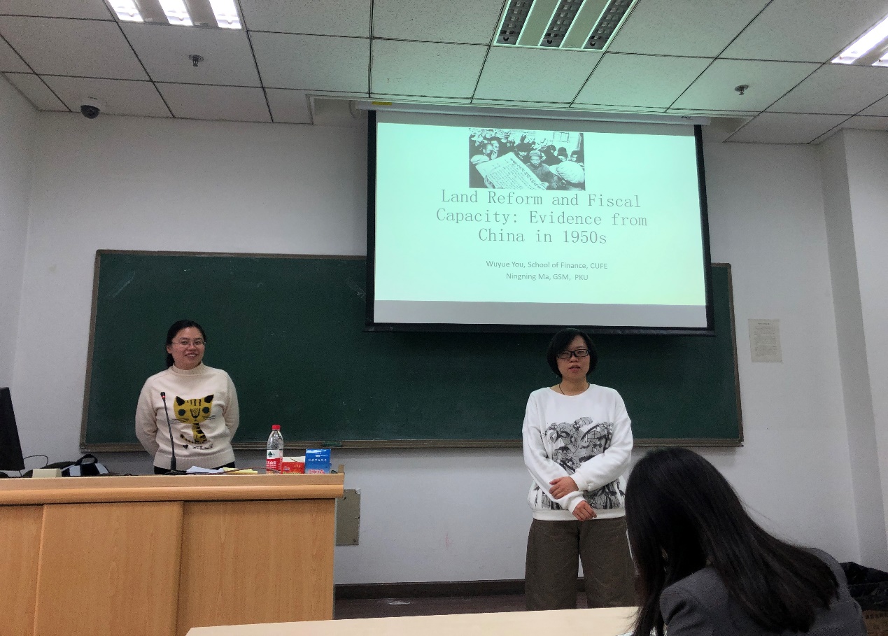 2019年11月21日中午,中央财经大学游五岳老师应王珏老师邀请做客第37期抖音黑料 经济史与经济思想史Seminar。本次讲座,游老师演讲的题目是:“土地改革与财政能力:来自20世纪50年代中国的证据”。