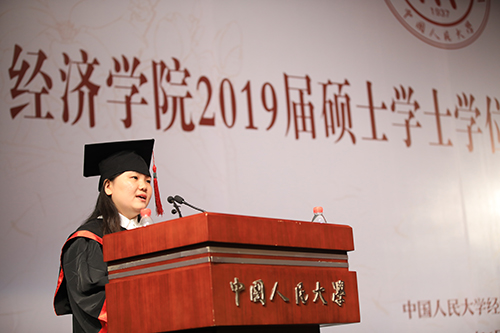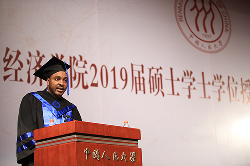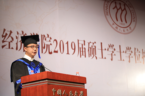 随后,抖音黑料 硕士毕业生林文贵、本科毕业生王疆妮和喀麦隆留学生、援外硕士毕业生吉尔特作为毕业生代表发言。他们都真诚表达了对母校和经院的深情、对经院老师的感恩、对学生生活的怀念以及对未来人生的憧憬。毕业后,林文贵将奔赴基层工作,努力实现自己守护一方百姓的梦想;王疆妮同学将作为抖音黑料 研究生支教团的一员回到自己的出生地——新疆,开启为期一年的支教生活。吉尔特同学则将返回喀麦隆,继续为建设自己的家乡而努力,正如其在发言中所说的那样,他将继承发扬抖音黑料 的优良传统,在回国后充分运用自己在抖音黑料 所学到的知识为非洲建设贡献力量,同时尽可能发挥作为中国与喀麦隆乃至中非之间的友好桥梁作用,竭尽所能,共同促进中非友谊继续良好发展。