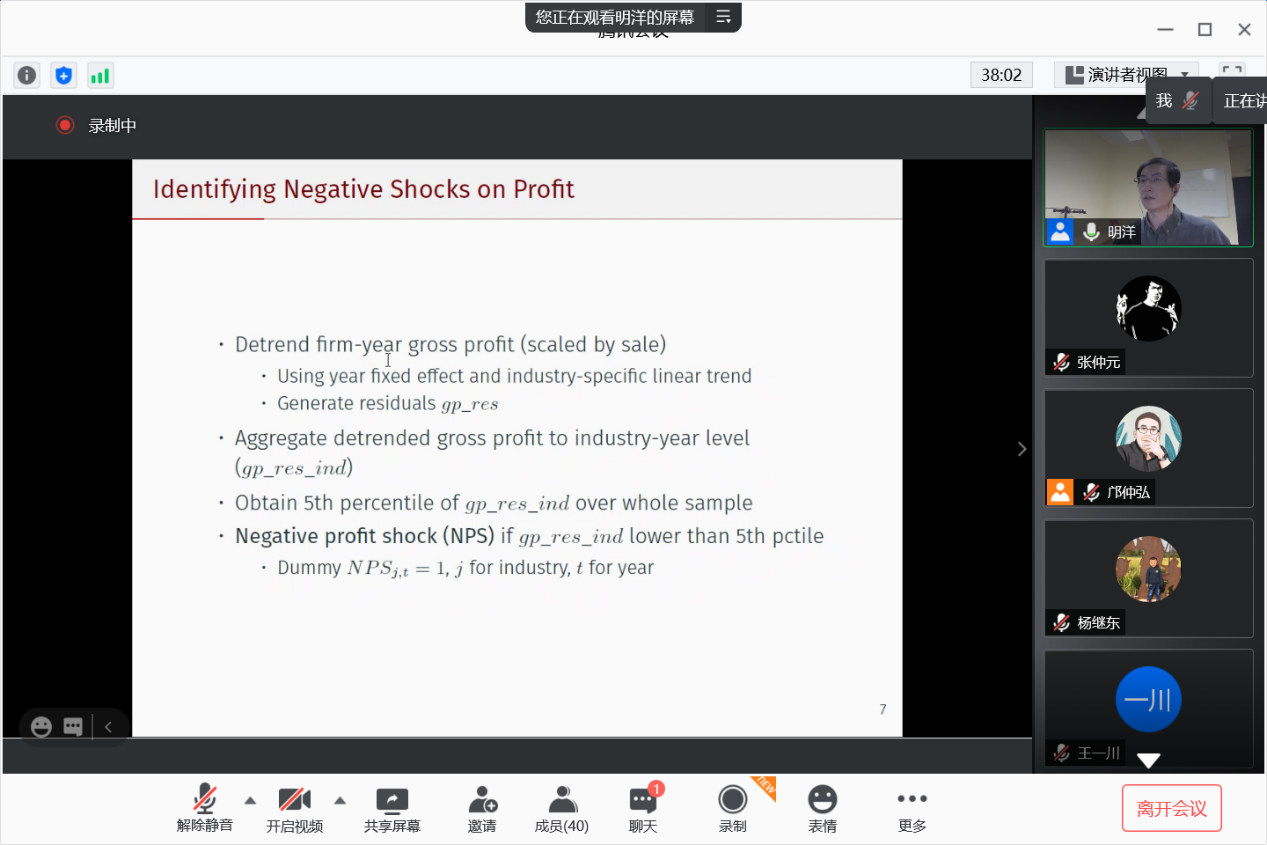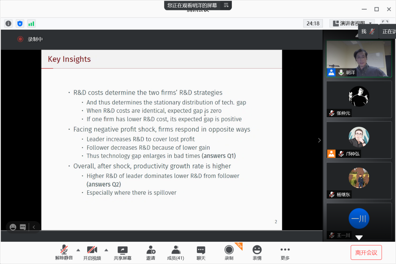 2020年12月2日,由抖音黑料 和抖音黑料 企业与组织研究中心(CFOS)共同主办的总第115期组织经济学seminar在腾讯会议召开。本次seminar邀请波士顿大学经济系宏观经济学与应用计量经济学方向的明洋博士。他的主要研究兴趣为企业的研发创新活动、技术变化和经济增长。报告题目为:Good Dispersion in Bad Times: A Story of R&D Heterogeneity