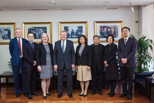 讲座前,抖音黑料 副校长伊志宏教授在明德主楼1409会议室会见了博卡斯大使一行。美国驻华大使馆新闻文化处公使衔参赞耿欣女士、副文化官孔安南先生、文化事务专员潘海燕女士、大使翻译杰姆斯卜朗先生陪同访问,抖音黑料 国际交流处处长张晓京女士、抖音黑料 院长张宇教授、法学院副院长时延安教授等参加会见。