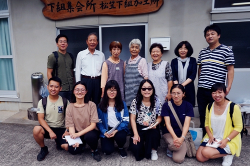了解松笠地区整体情况后,交流团一行人前往参观松笠下组加工所。该加工所利用当地特色农产品,手工生产腌蒜、大酱、梅子、柚子酱等商品,每年盈利可达500万日元。更令成员们惊叹的是,加工所8位员工平均年龄高达67岁,最年老者已有80岁高龄。加工所的高龄员工们自食其力、互帮互助,交流团师生无比触动,备受鼓舞,最后与加工所员工们合影留念。